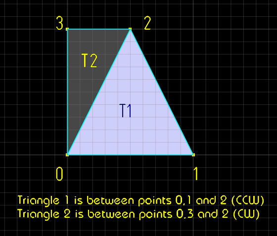T1 is visible (face oriented to face the user), T2 is reversed, because drawn in the opposite direction (CW)