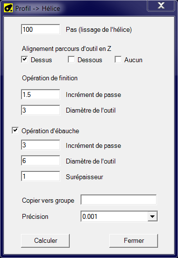 Le plugin apparait dans le menu Dessiner/Profil -> Hélice La version 6 ajoute la possibilité de copier les parcours générés vers le centre d'une série d'objet de dessin appartenant au même groupe. Cela présupose l'utilisation du plugin Groupes. Le nom du groupe doit être entré dans le champ Copier vers groupe (sensible à la casse) La version 7.0 ajoute une option de choix de la précision de calcul. |