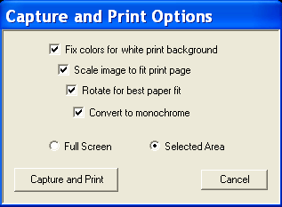 Fix colors for white print background: Background is set to white, and the white drawing objects are set to black. Scale image to fit print page: Scale the output to fit the entire page. Rotate for best paper fit: If needed, rotate the output to best fit the page. Convert to monochrome: Colors are converted to gray scale. Full screen/Selected area: Switch between full screen capture and an area that can be selected by mouse Capture and print: If selected area is checked, you are prompted to select a rectangular area by mouse ; when the selection is finished, hit the Enter key to continue. Cancel: Exit without printing |