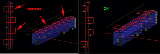 Sur l'image suivante, à gauche, les attaches sont trop longues et recouvrent le parcours d'outil qui se trouve de l'autre coté de la pièce, 2 attaches ne sont pas détectées du bon coté (valeur de 1 pour les deux paramètres). La modification des valeurs de Echelle intérieure des attaches et Echelle extérieure des attaches permet de régler le problème (image de droite, valeur de 1 pour l'extérieur, de 0.3 pour l'intérieur)