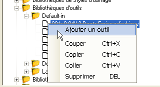 Créer un nouvel outil: Trois possibilités, par le menu contextuel de la bibliothèque avec Nouvel outil, par le menu contextuel d'un outil avec Ajouter un outil ou par un copier/coller ou couper/coller d'un outil existant par le menu contextuel d'un outil avec les commandes Couper/Copier/Coller.