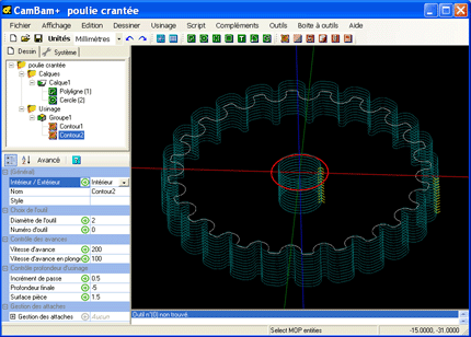 Ce tutorial utilise les fonctions du menu Compléments/Boite à outils de CamBam pour générer le profil de la poulie.