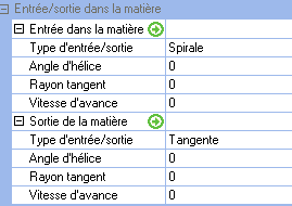 Pour l'instant les opérations concernées sont les opérations de Contour, d'usinage de Poches et de Profilage 3D. Ces opérations comportent deux propriétés multiples appelées Entrée dans la matière et Sortie de la matière.