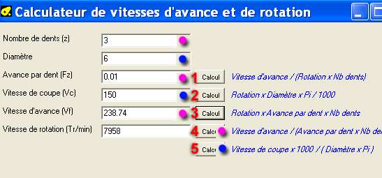 Les boutons 1,2 et 4 permettent de calculer la valeur qui leur fait face après une modification manuelle d'un des autres paramètres. La vitesse de rotation possède 2 boutons car elle peut être calculée soit en tenant compte de la vitesse d'avance et de l'avance par dent