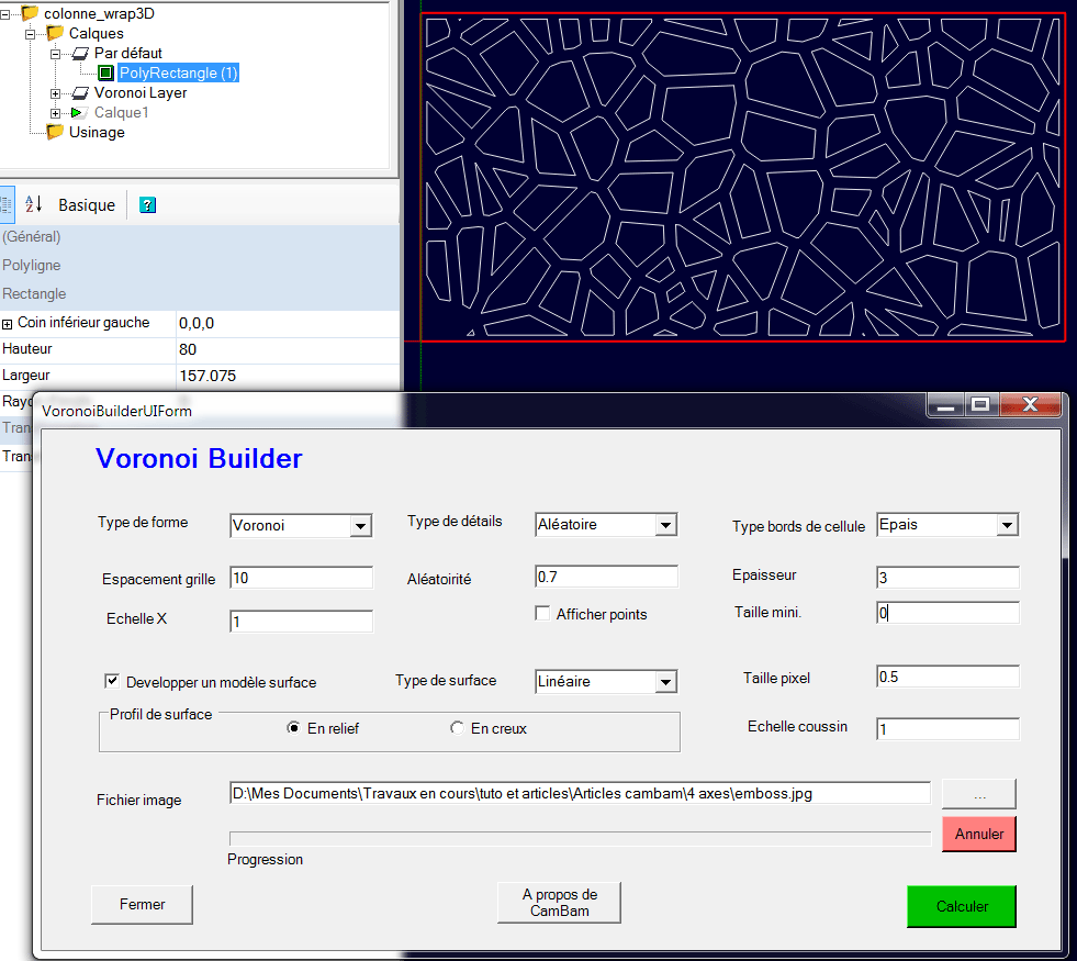 La surface texture 3D ci-dessus à été faite sous CamBam à l'aide du plugin Générateur de Voronoi, qui à permis de créer les cellules en 2D (les pierres) comme ci-dessous