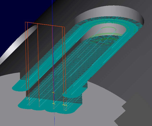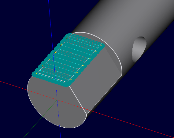 Il ne reste plus qu'a donner une valeur pour Largeur d'usinage ; dans le cas présent, le plat fait 20mm de long, nous allons donner une valeur un peu plus grande afin que la fraise ne prenne pas toute la largeur de passe d'un coup ; entrez 22 pour Largeur d'usinage puis régénérez les parcours. Vous devriez obtenir le résultat suivant: