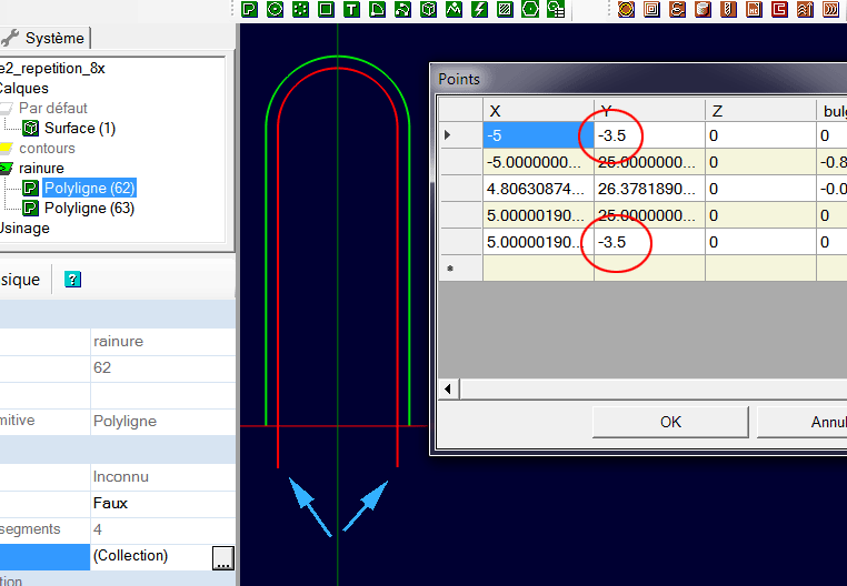 Si l'usinage ne se fait pas du bon coté de la ligne, inversez la valeur de la propriété Intérieur/Extérieur et régénérez les parcours afin d'avoir l'usinage du bon coté.