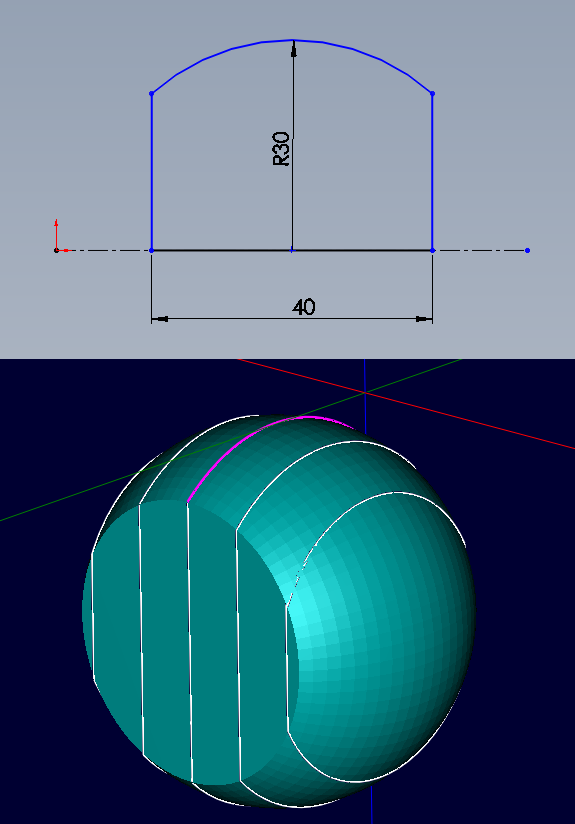 Tout comme pour la gravure ci-dessus, l'enroulement d'une forme 3D ne pose pas d'avantage de problème et se fait exactement de la même manière ; l'objet 3D "plat" devra être positionné au rayon et les parcours d'outil seront produits comme pour n'importe quel usinage 3D "standard", c'est le post processeur RotaryX ou RotaryY qui générera un GCode enroulé.